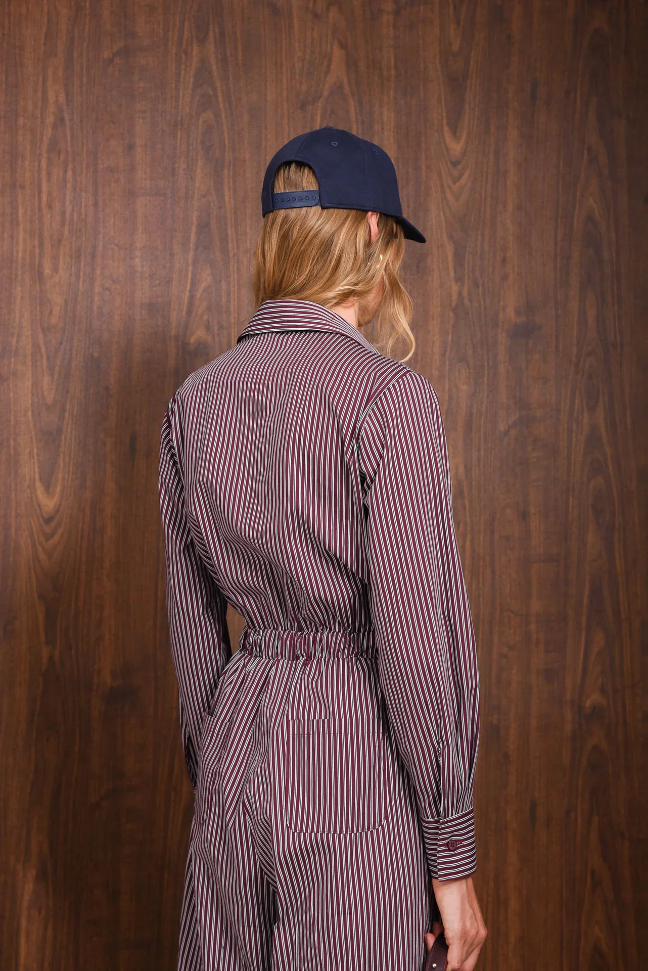 The Trust jumpsuit is crafted in dark blue denim with a relaxed, wide-leg fit. It features a classic shirt collar, button-up front, long sleeves with buttoned cuffs, and a single chest pocket. The adjustable drawstring waist adds shape, while side pockets bring functionality. Designed to keep you stylish and comfortable with no effort.