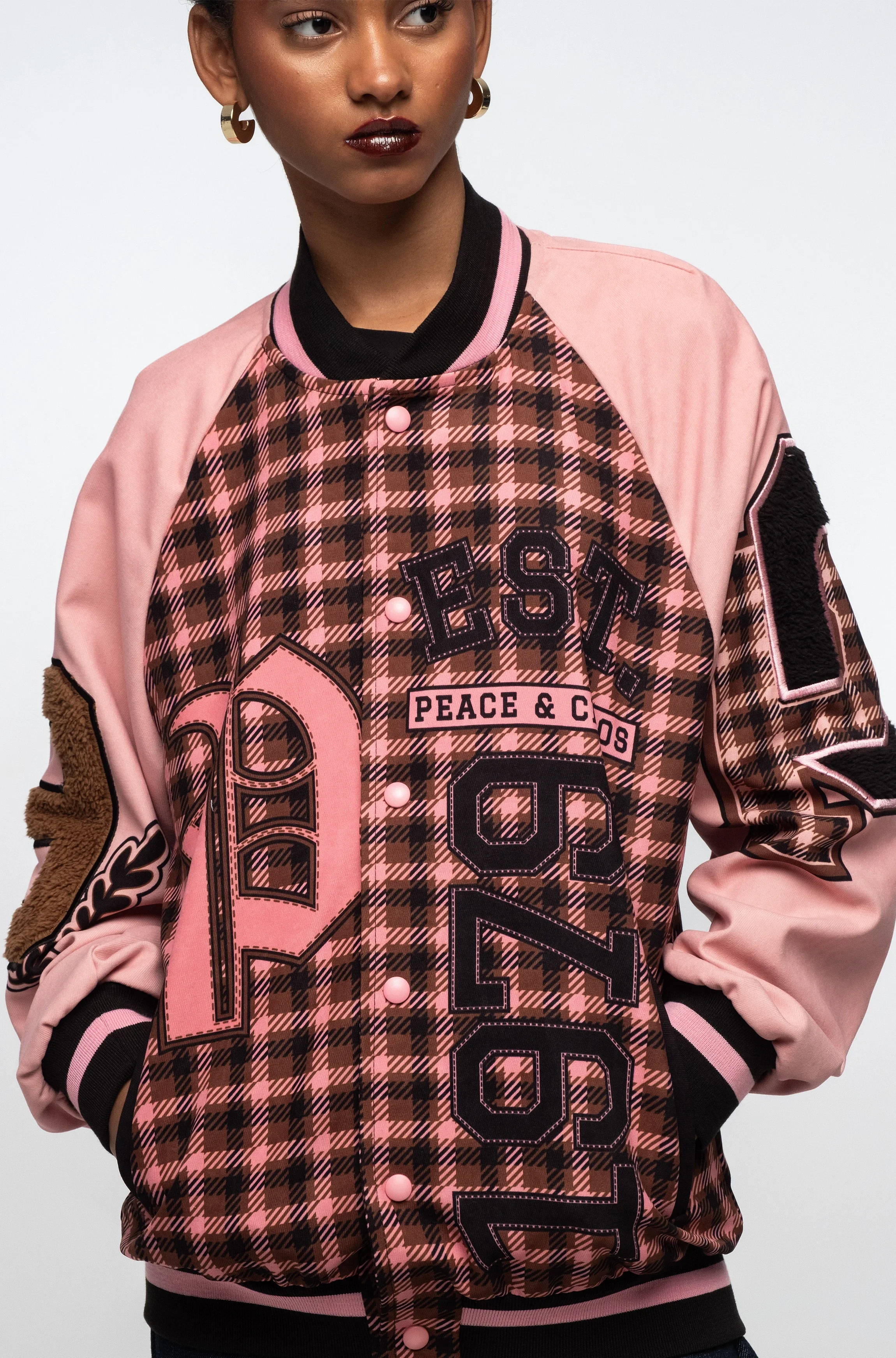 Logo Peace and Chaos and metallic buttons on the sleeve